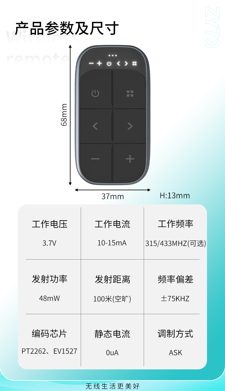 ZY73是我公司新开发的可充电的遥控器,TYPE-C接口,具有可靠性高、频率稳定、穿透能力强等特点;