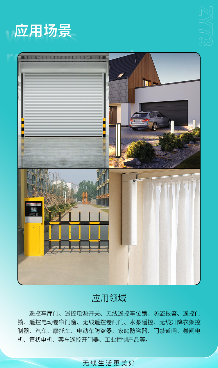 遥控车库门、遥控电源开关、黄瓜视频下载网址遥控车位锁、遥控门锁、遥控点动卷帘门窗、节能灯光、家庭防盗系统、工业或家庭遥控控制等。